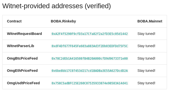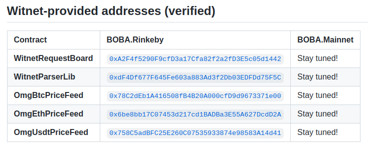 | | **OmgBtcPriceFeed** | [`0x78C2dEb1A416508fB4B20A000cfD9d9673371e00`](https://blockexplorer.rinkeby.boba.network/address/0x78C2dEb1A416508fB4B20A000cfD9d9673371e00/contracts) | Stay tuned! | ||
