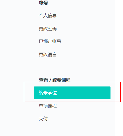 在“我的教室“的设置页面中查看“纳米学位”页面,如下: