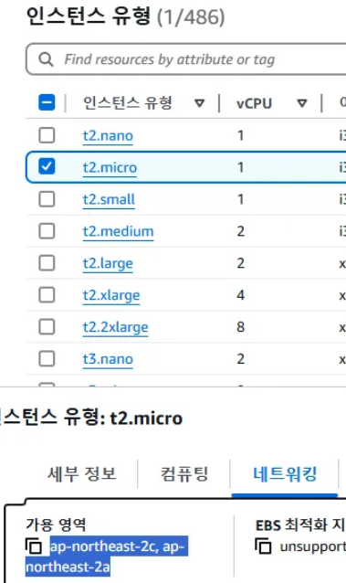 오토스케일링 그룹 생성 시, ‘유효하지 않은 가용 영역’이라는 오류가 나며 생성을 실패한 경우가 발생했다. 이는 인스턴스 유형에 따라 가용 영역이 제한되는 경우가 있었기 때문이고, 인스턴스에 맞는 가용영역을 선택하여 해결하였다.