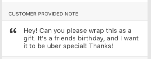 Display a single order view with the third cell's data. <img width="260" alt="screen shot 2018-04-05 at 8 36 40 am" src="https://user-images.githubusercontent.com/1062444/38369077-82b92ed0-38ac-11e8-8556-5a89ea5e5161.png"> ## To Do - [x] Customer provided note table section header - [x] quote icon - [x] customer note - [x] do not display this section if the customer note is empty