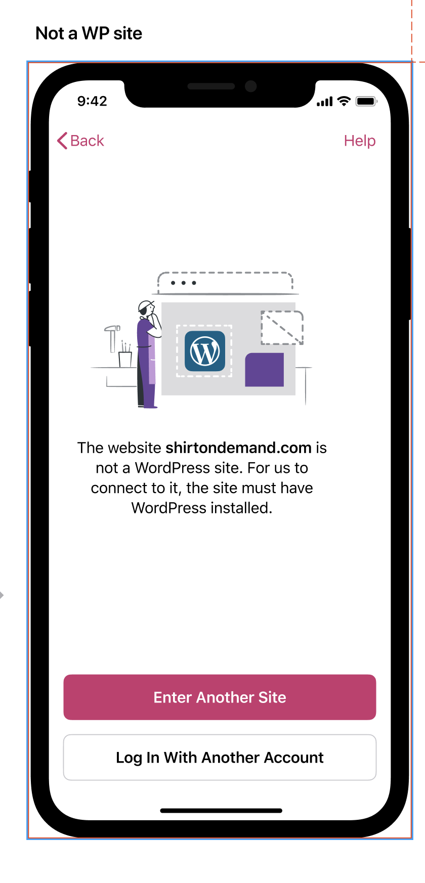 Implement UI for error screen when user enters a site address that does not correspond with a WordPress site <img src="https://user-images.githubusercontent.com/2722505/100408424-ec78aa00-30a5-11eb-9704-0e32726b74c0.png" width="350"/>