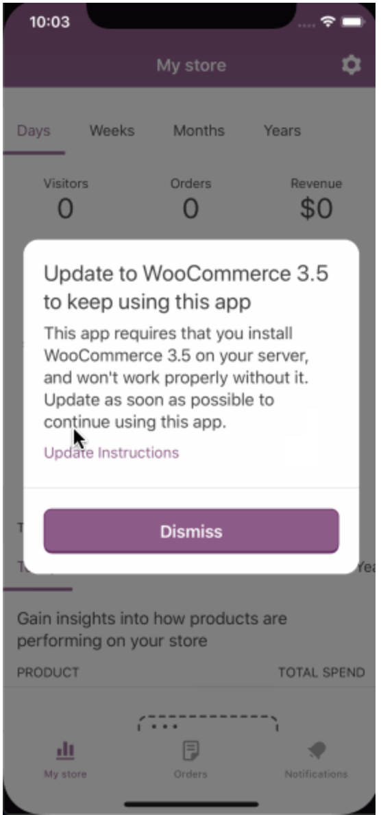 This PR adds the following a fancy alert warning if the users current site is below WC v3.5 (below REST API v3). The version check and subsequent alert (if needed) is fired every time the app enters the foreground.