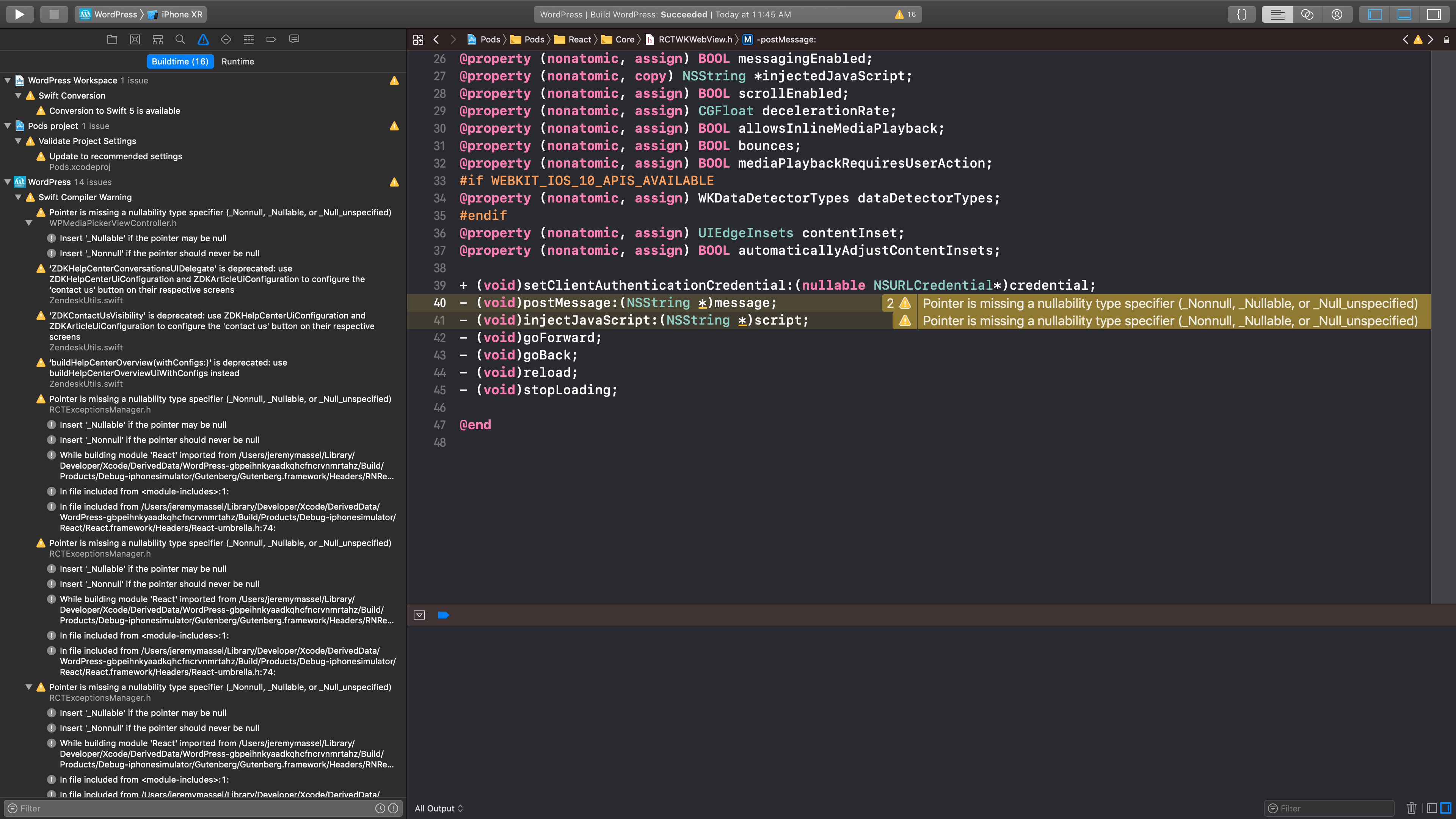 @jkmassel I have tried several things to suppress the nullability warnings, but so far nothing has worked. I also cannot reproduce the issue in any other project. I have opened wordpress-mobile/MediaPicker-iOS#320 to at least eliminate the warning we have control over. |