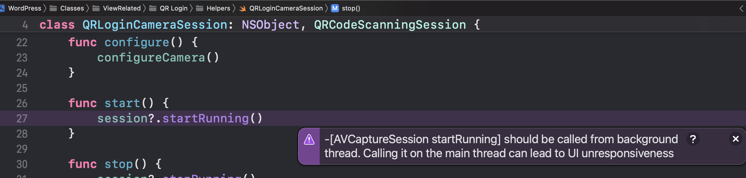 Xcode said: > Thread Performance Checker: -[AVCaptureSession startRunning] should be > called from background thread. Calling it on the main thread can lead to > UI unresponsiveness