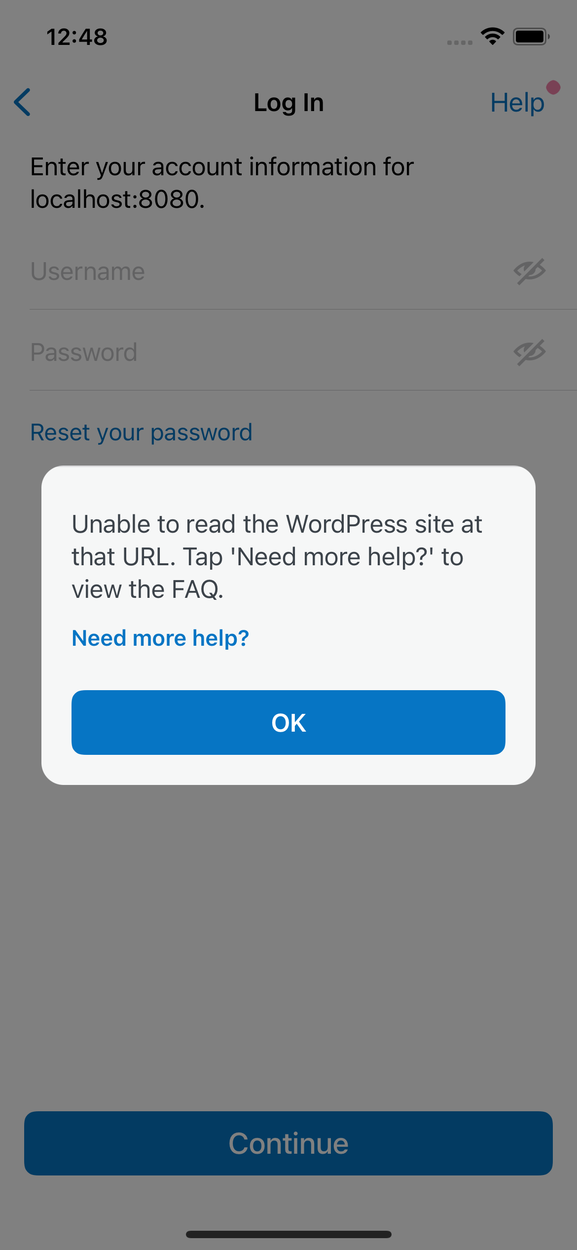 This PR updates the error message "Unable to read the WordPress site at that URL. Tap 'Need Help?' to view the FAQ." to match the button label, which is "Need more help?"