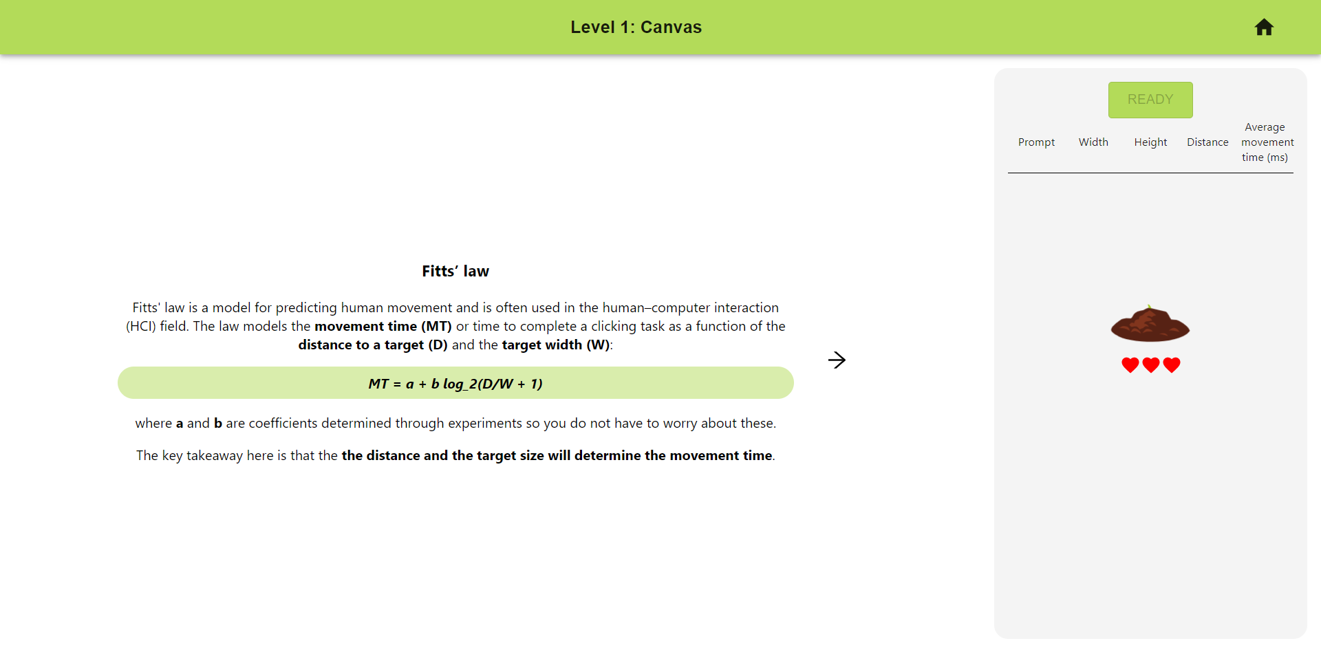 Two versions have been developed for comparison purposes. Game version contains elements of a reward system with the plant while the static version is purely an interactive activity. They both serve to educate users on the importance and usage of Fitts' law through interactive activities.