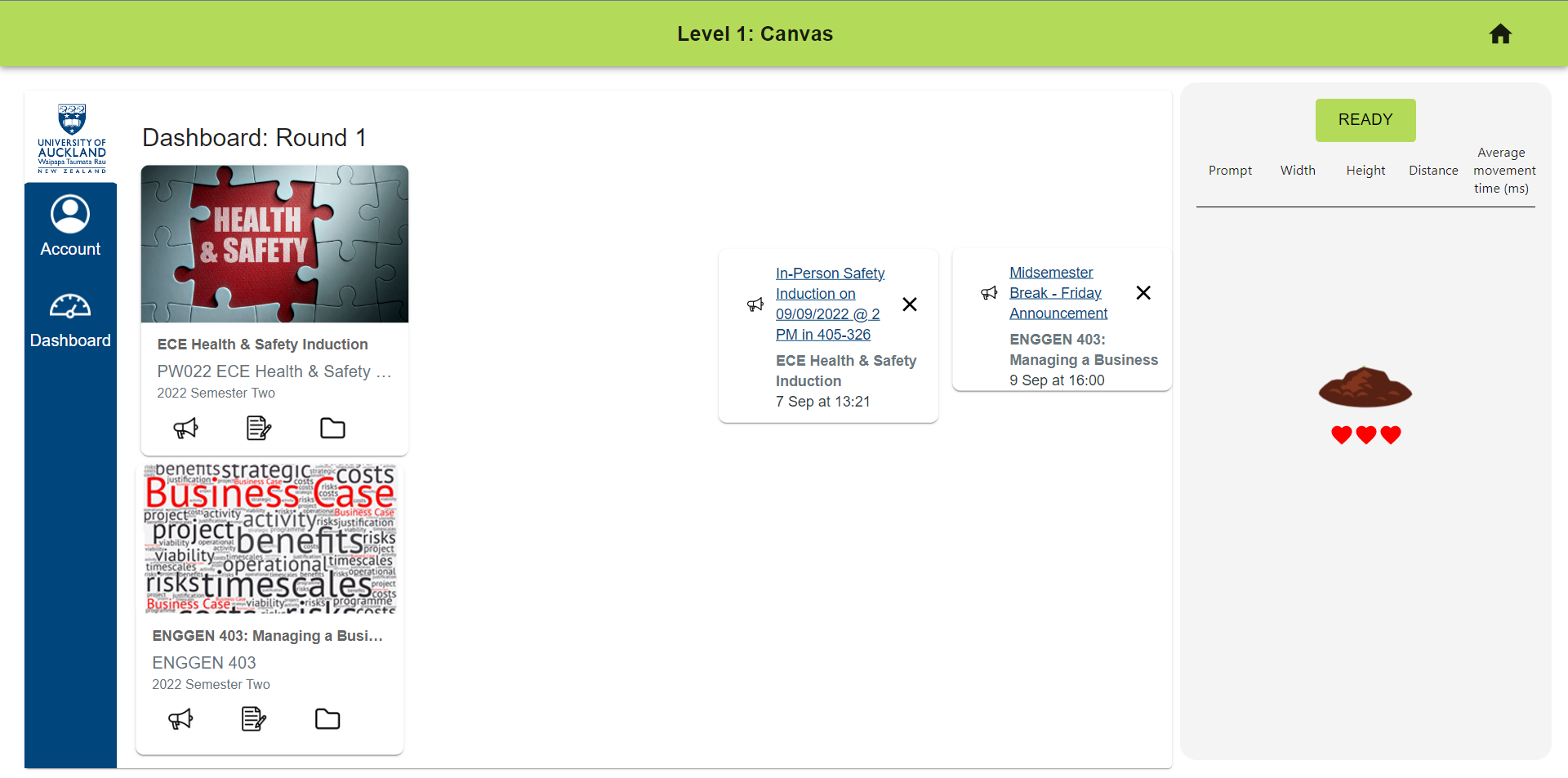 Once the designing of the interface is done, click the 'ready' button on the right side menu to begin the clicking tasks. These will be a series of clicking between a set of 2 buttons to determine if the interface best follows Fitts' law. Visual and text prompts will be shown to guide you through the clicking tasks. If an attempt has improved from the previous one, results on the right-hand side will be coloured green. Otherwise, it will be coloured red to show the current attempt was not an improvement and one life will be deducted. If there no further improvement is made after 3 attempts, the plant dies.