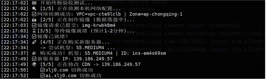 nohup python3 monitor.py > monitor.log 2>&1 &实现完全自动化 (检测到即将销毁 -> 自动备份当前时刻服务器 -> 自动创建快照 -> 自动创建镜像 -> 自动获取当前服务器配置信息 -> 创建新的同类型服务器(对于可能库存不足的服务器会多测试几次不同类型) -> 修改CDN域名源站地址到心服务器 -> 不间断自动化完成)