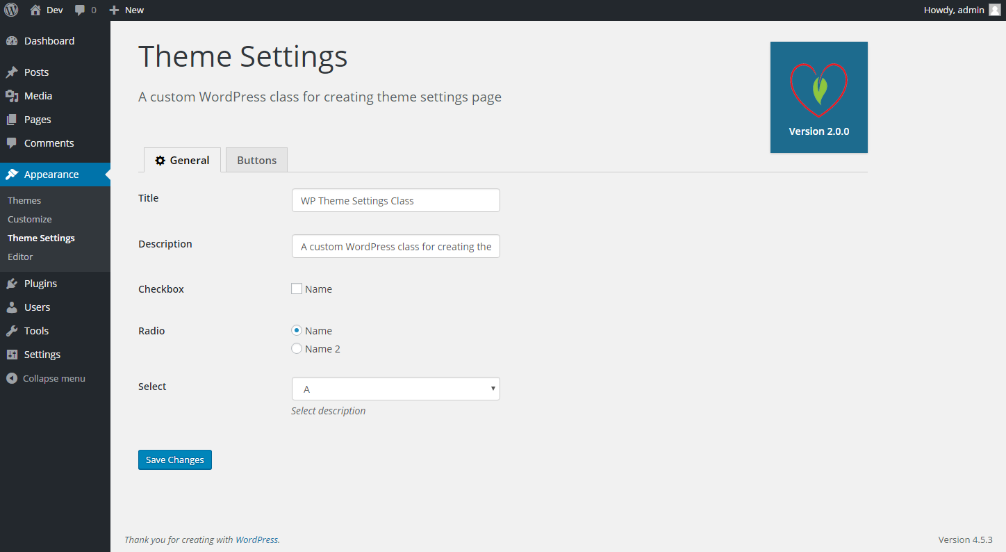 A custom WordPress class for creating theme settings page (Design looks identical to WP About page)