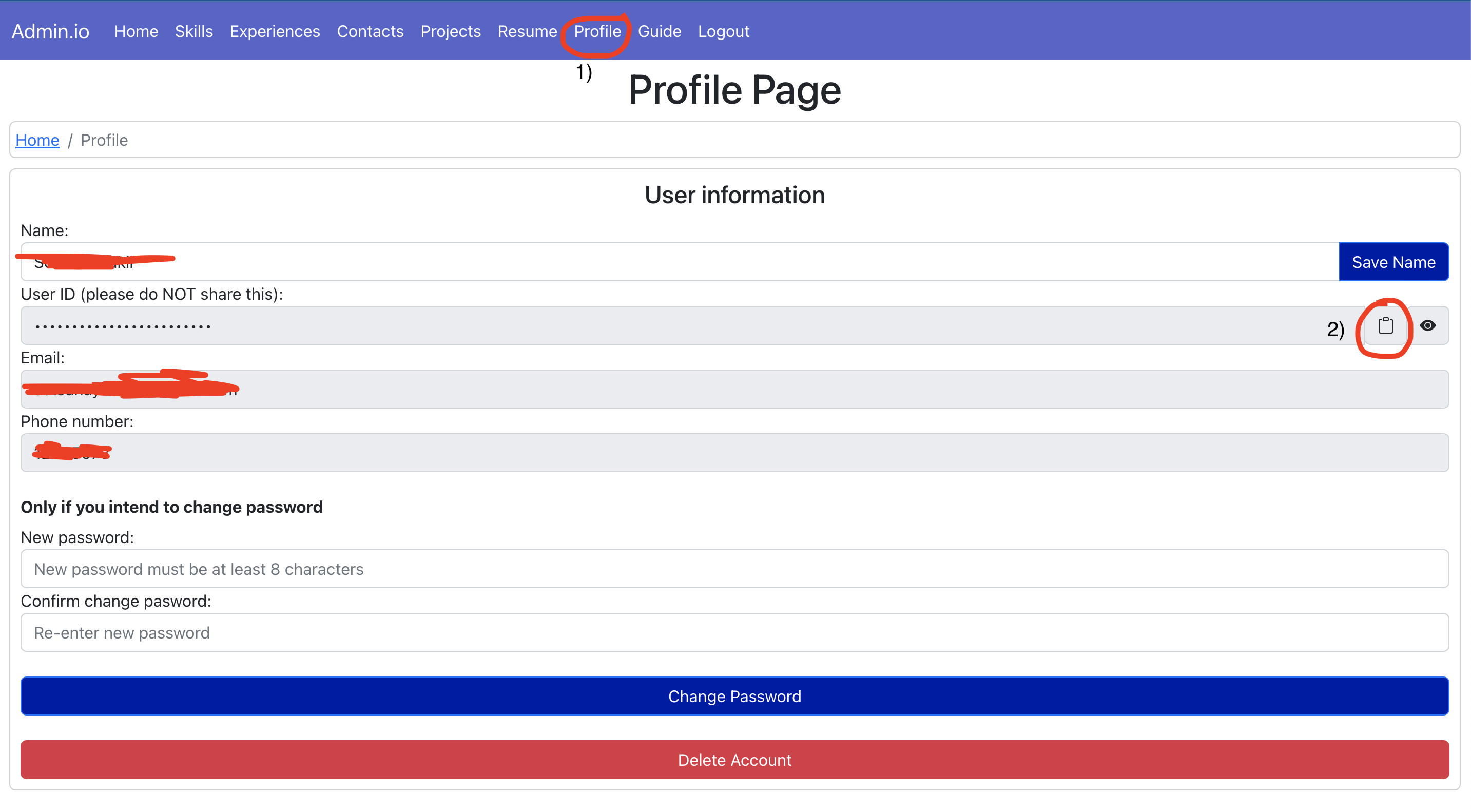 1. After logging in, click 1)"Profile" on the top bar and then the 2)"Clipboard icon" to copy your unique user ID (NOTE: your User ID is unique to you and please do NOT share your User ID with other people)