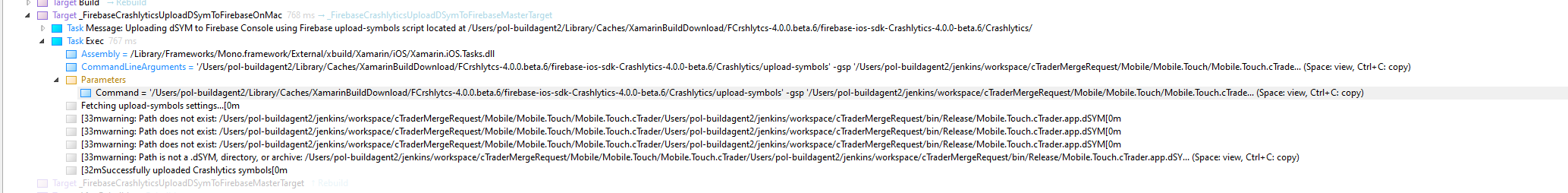 That means, old xamarin framework uses Absolute path for $DeviceSpecificOutputPath and uploading of dSYM file will fail.
