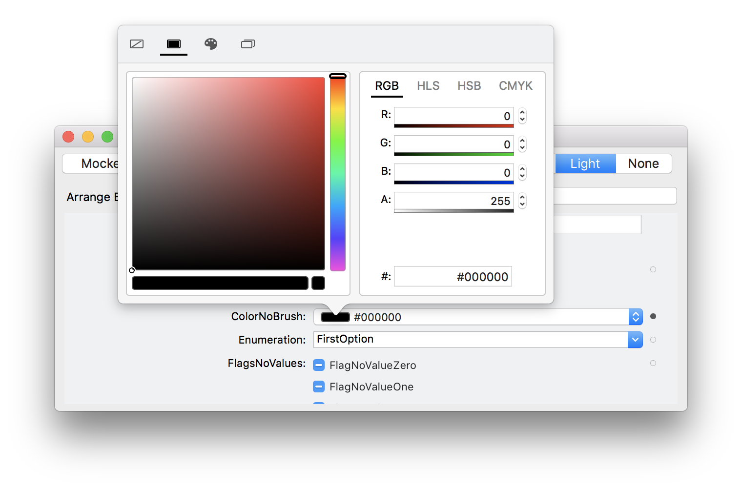 On Mojave dark mode with the light theme selected, the color popup background isn't set and appears dark, making the selected tab icon hard to read. |