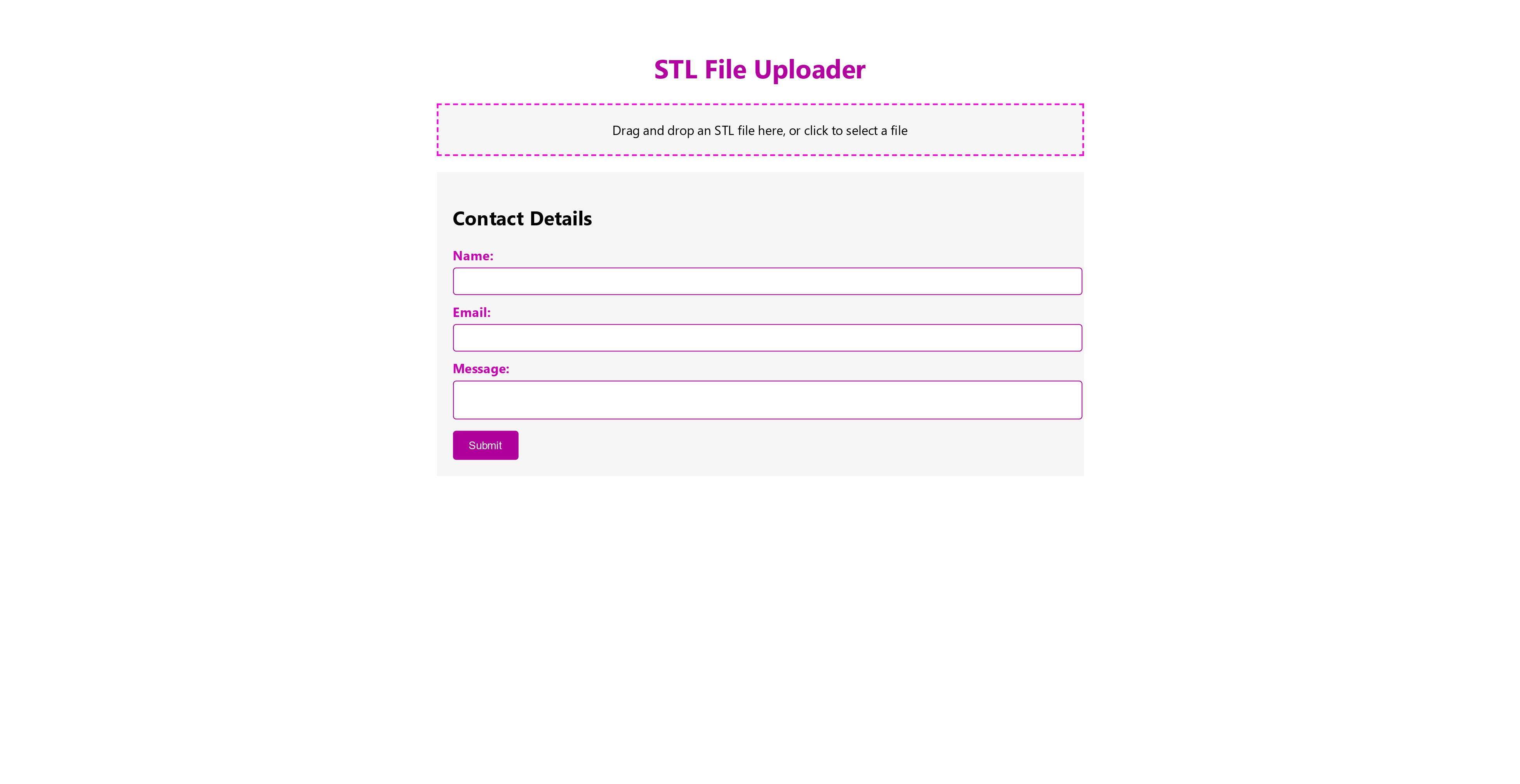STL File Vault is a web application that provides a secure platform for users to upload and store STL (Standard Tessellation Language) files. It offers an intuitive interface for uploading files, collecting contact details, and securely storing them on the server.