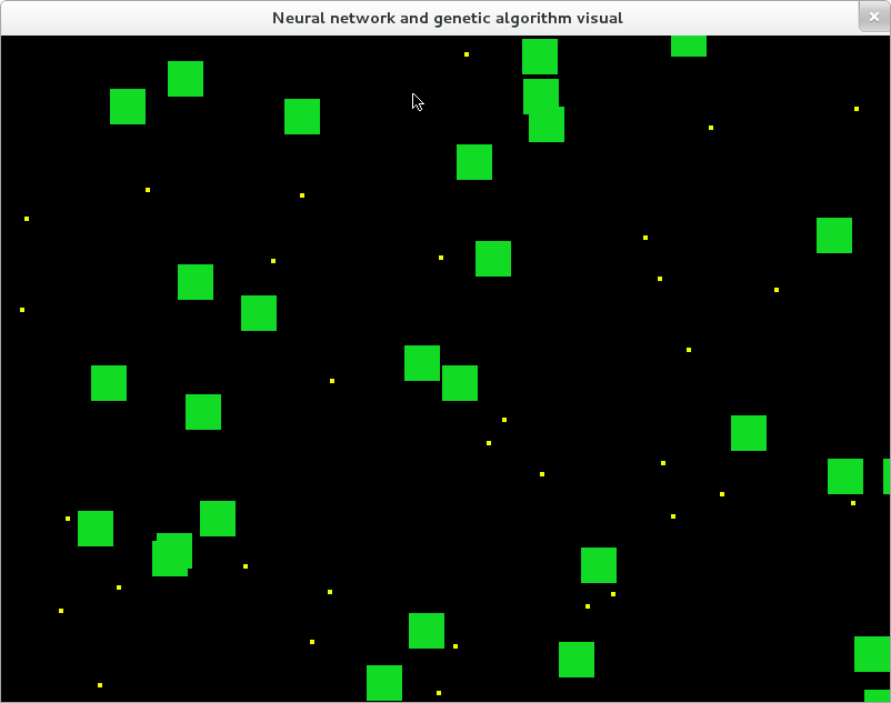 To get started with the demo, SDL is needed. In the demo there are 30 squares, each with it's own neural network. One genetic algorithm trains them all. The goal of each square is to collect as many yellow dots as possible. The neural networks get an 4 inputs: a normalized x and y of the closest mine and a normalized x and y of the direction it is facing. The 2 outputs determine determine how the square moves. The more yellow dots a square collects, the higher it's fitness becomes. Heres a picture.