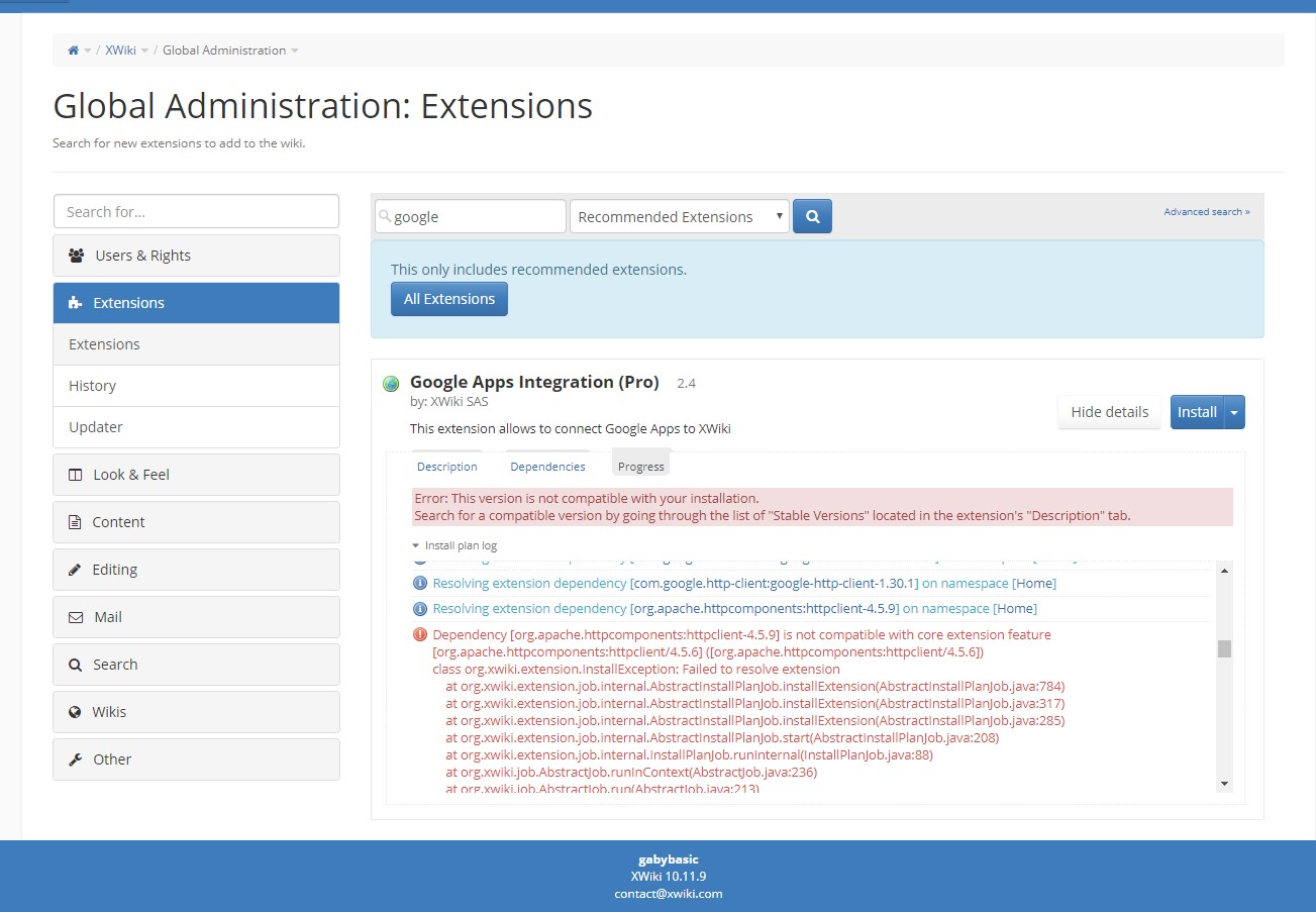 Steps to reproduce: 1. Access a cloud instance or a local one 2. Install the Google App 2.4 Expected results: The app is installed. Actual results: The app can't be installed, compatibility issues appear. Environment: XWiki 10.11.9 and 8.4.5 with Chrome 76   https://up1.xwikisas.com/#ufEzF4DyF7GO4QGoOveAWg