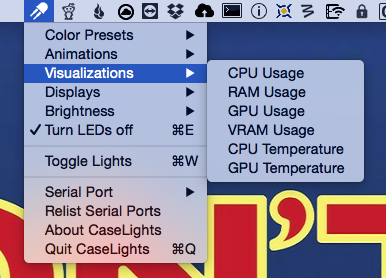 CaseLights is an Arduino based RGB LED controller using a simple MOSFET setup. The lights are controlled with a Mac OS X Menu Bar App that can set static colors, animations, or visualize various computer status values using the included libraries JSystemInfoKit and EZAudio.