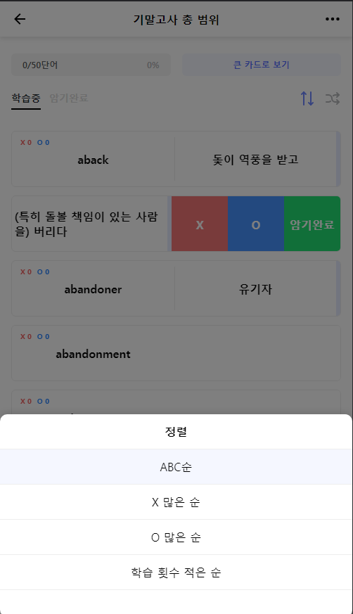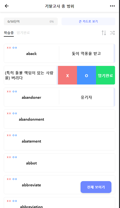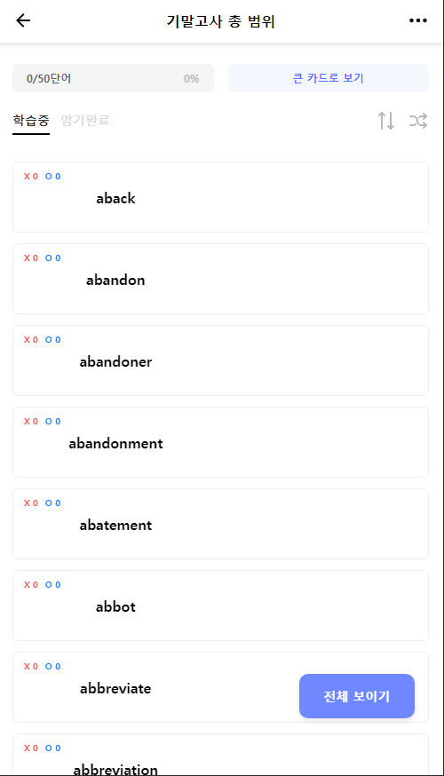 등등 번역, 단어의 위치 변경, 암기 완료, 학습 분류, 전체 보이기, 상태 유지 기능을 구현했습니다.