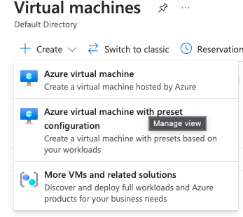 Next, on the Virtual Machine page, select 'Create' and from the drop down menu select Azure Virtual Machine.