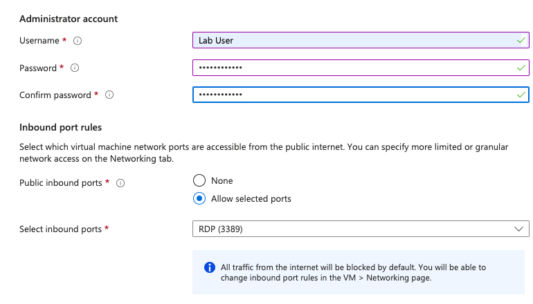Next, create an Administrator account. This account will be used to log in to the VM. Check the Licensing box then select Review & create. On the following page the site will review all the credentials and once the validation passes, select create and deploy the VM.