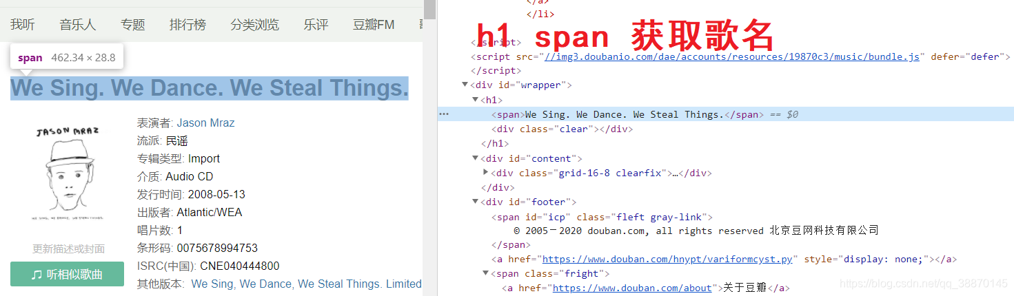 name=soup.find(attrs={'id':'wrapper'}).h1.span.text#歌名