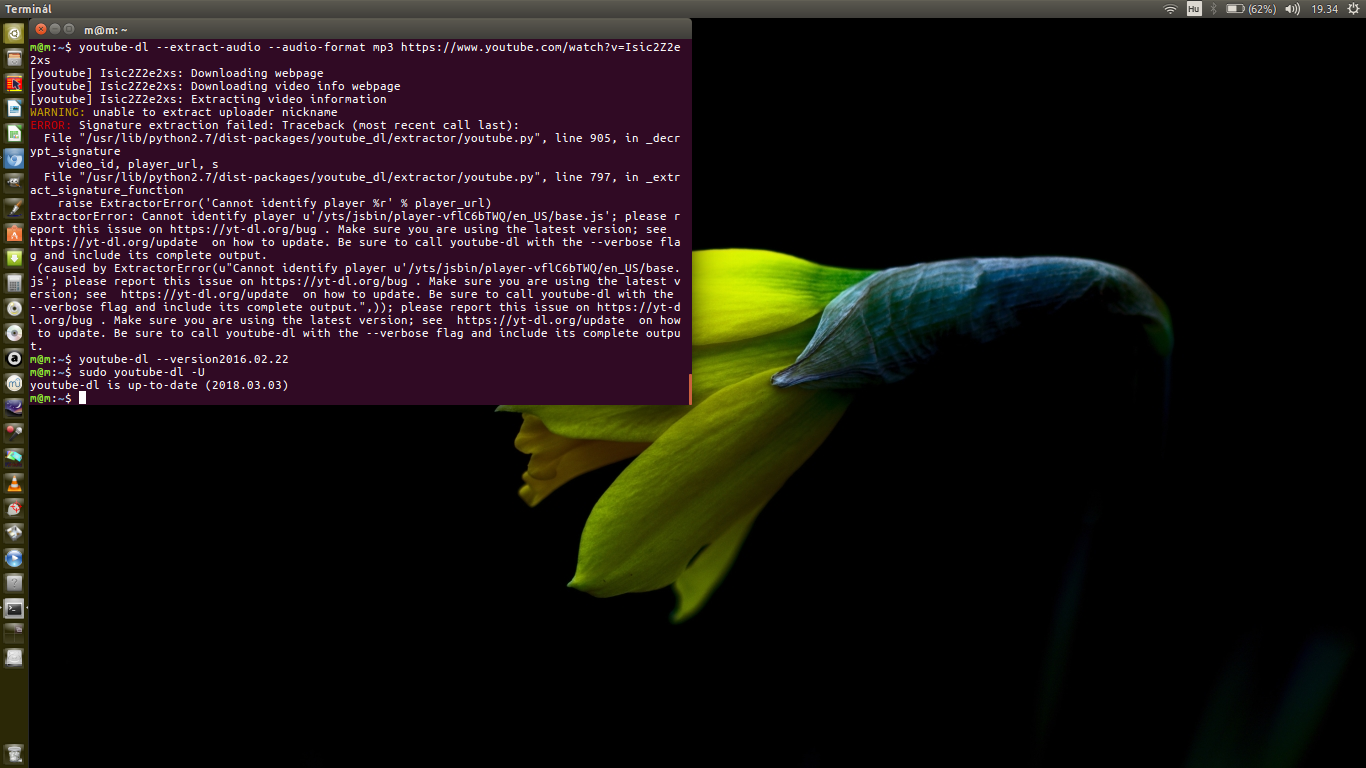 I have problems downloading videos from Youtube with youtube-dl. I was able to do it only once, since then not a single try has been succesful.