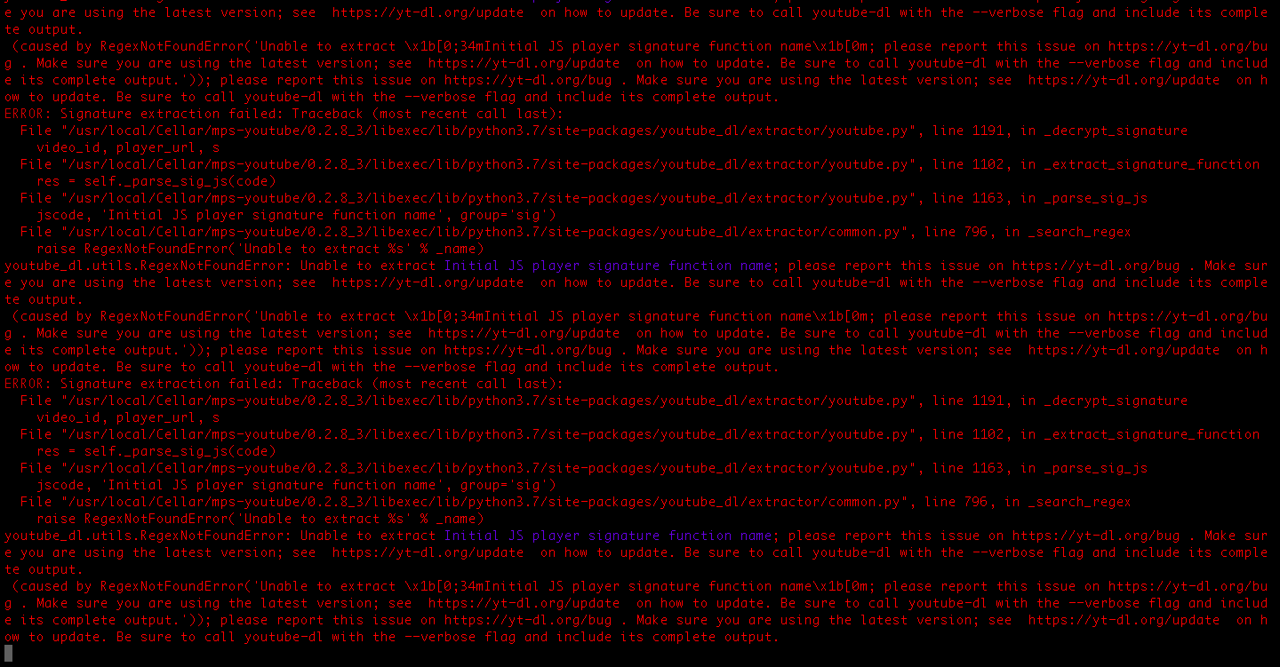 I use mpsyt for 9months, now I have this issue, When I trie listen the music, the output give the message (unable to extract Initial JS Player signature function name).
