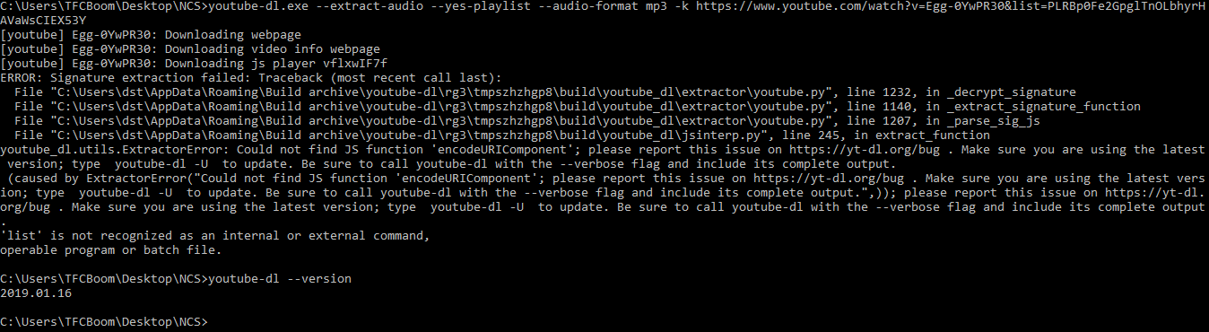 youtube-dl --versionand ensure your version is 2019.01.16. If it's not, read this FAQ entry and update. Issues with outdated version will be rejected.Before submitting an issue make sure you have: