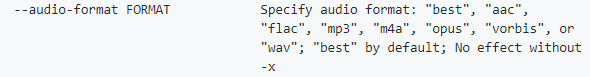 @dstftw In addition, it's "--audio-format", not "--audio-codec". So literally, "webm", an audio file format, is still fit to that option, and it "host" only opus audio, so there will be no confused |