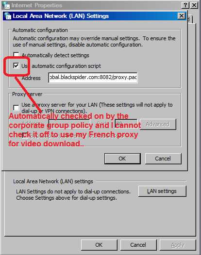 However, I cannot disable or bypass the Automatic Configuration Script (proxy.pac) set by the corporate Group Policy in my browser LAN Settings to download videos using a French proxy..