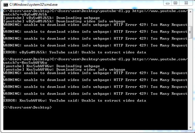 and when i try downloading youtube video i keep receiving warning saying too many request and error unable to extract video data(Capture2)