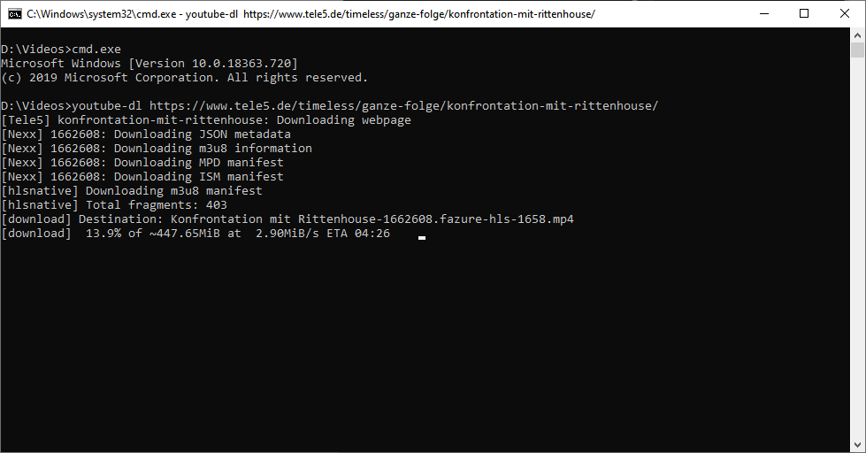 Try this: youtube-dl.exe --cookies D:\Videos\cookies.txt --no-check-certificate https://www.tele5.de/star-trek/enterprise/ganze-folge/im-schatten-von-pjem/ |