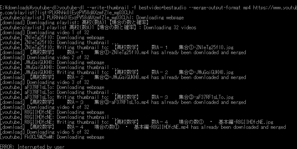 E:\downloads\youtube-dl>youtube-dl --write-thumbnail -f bestvideo+bestaudio --merge-output-format mp4 https://www.youtube.com/playlist?list=PLKRhhk0lEyzPV58dAXzmfZle_wg03CLhl
