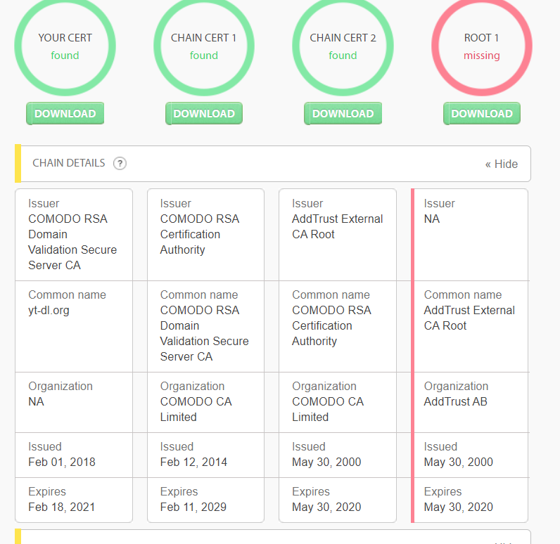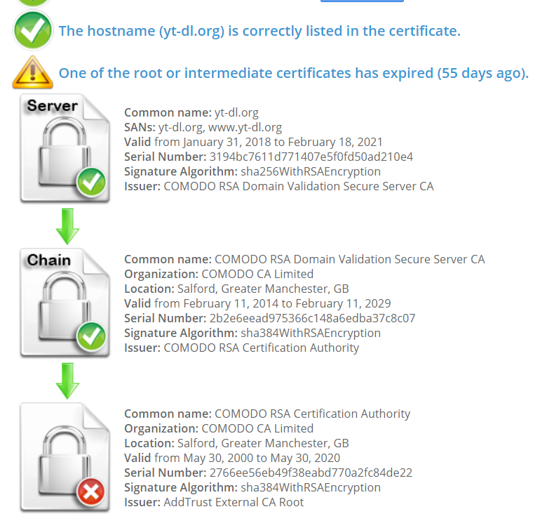 Umm all I see on the closed ones is "works for me" let me help with this issue: https://www.sslshopper.com/ssl-checker.html#hostname=https://yt-dl.org https://www.sslchecker.com/sslchecker Not a SSL guy but it's like depending on the URL or 301 or 302 redirect ??? some how its pulling different cert .. like I got cert error in Chrome then later it worked with the latesturl ... |