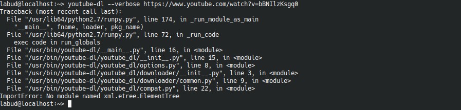 labud@localhost:~> youtube-dl --verbose https://www.youtube.com/watch?v=bBNIlzKsgq0 Traceback (most recent call last): File "/usr/lib64/python2.7/runpy.py", line 174, in _run_module_as_main "__main__", fname, loader, pkg_name) File "/usr/lib64/python2.7/runpy.py", line 72, in _run_code exec code in run_globals File "/usr/bin/youtube-dl/__main__.py", line 16, in <module> File "/usr/bin/youtube-dl/youtube_dl/__init__.py", line 15, in <module> File "/usr/bin/youtube-dl/youtube_dl/options.py", line 8, in <module> File "/usr/bin/youtube-dl/youtube_dl/downloader/__init__.py", line 3, in <module> File "/usr/bin/youtube-dl/youtube_dl/downloader/common.py", line 9, in <module> File "/usr/bin/youtube-dl/youtube_dl/compat.py", line 22, in <module> ImportError: No module named xml.etree.ElementTree labud@localhost:~>
