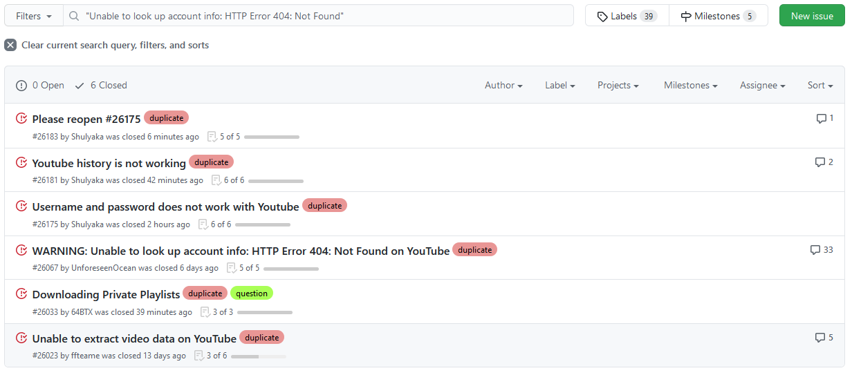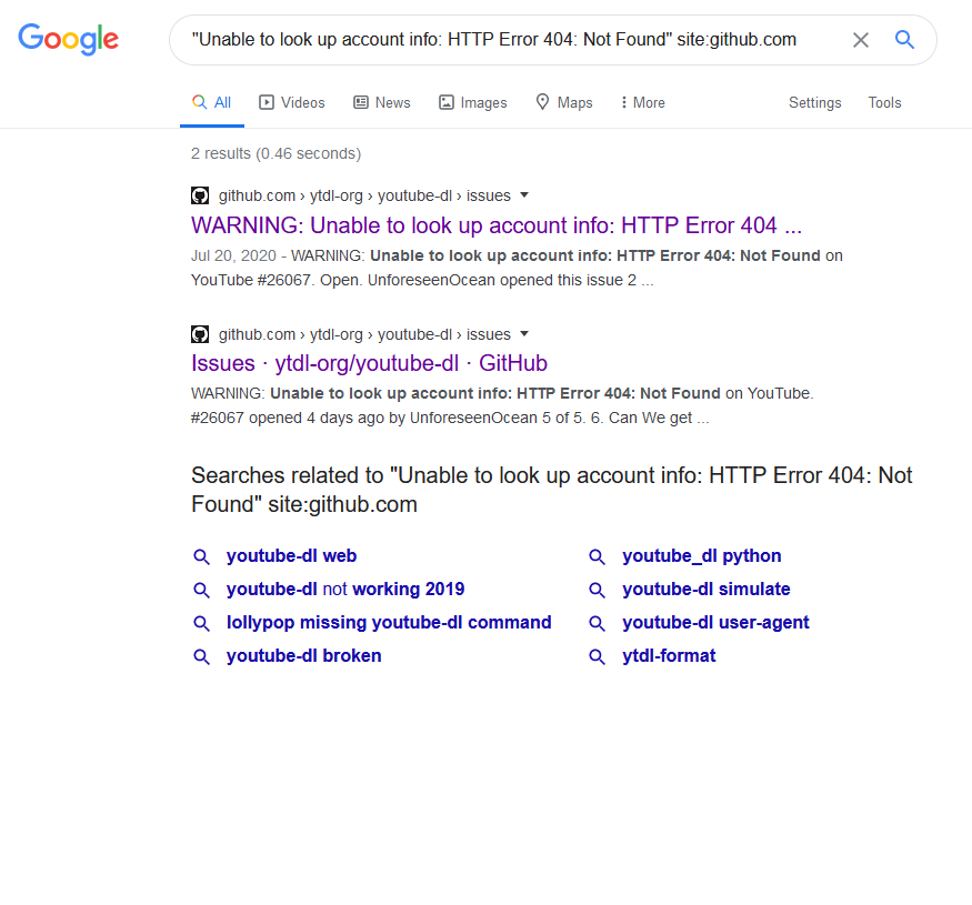 @dstftw on #26183 (comment) You've advised to search for "Unable to look up account info: HTTP Error 404: Not Found". Also tried with Google. 2 results: What am I doing wrong??? I am honestly trying to help! |