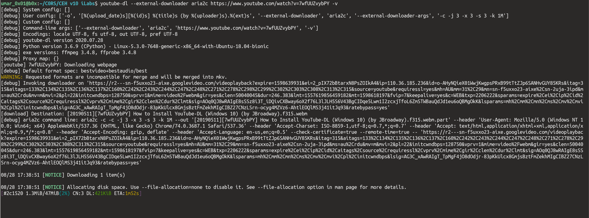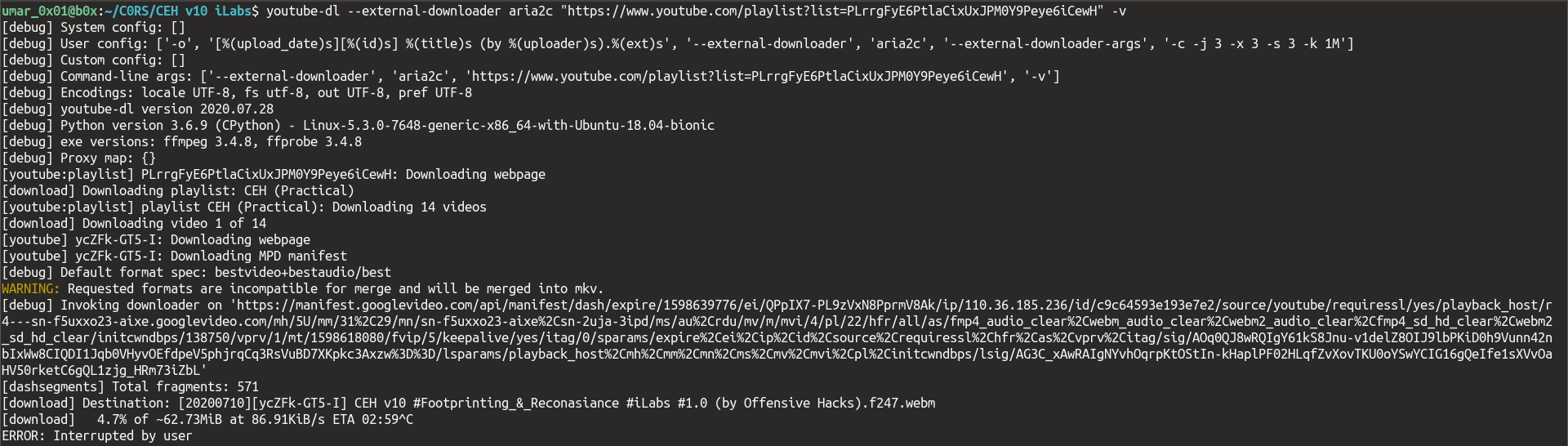 --external-downloader-argsand other arguments too, still the playlist isn't being downloaded with aria2.Whenever any other video or some other playlist URL is passed, it downloads that completely fine.