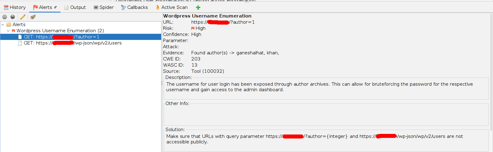 {BaseURL}/wp-json/wp/v2/users{BaseURL}?author={integer}Accessing these URLs on a vulnerable site can directly reveal all users and their usernames to an attacker. Our team at Astra Security would like to contribute the scan rule to check if a website is vulnerable to this enumeration technique or not.