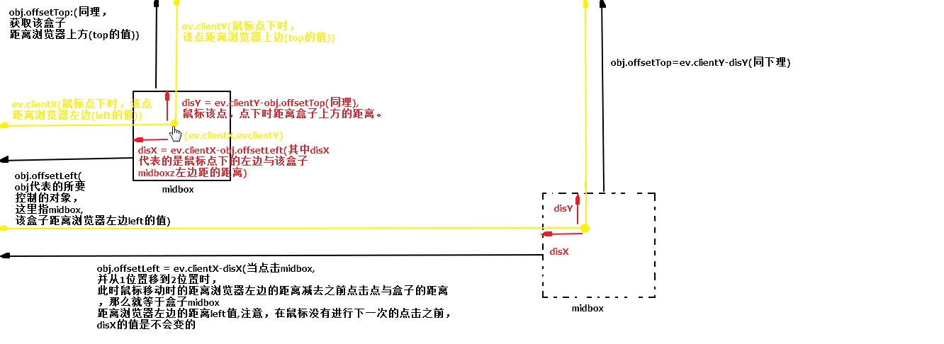 由上图清晰的可以看出,我们只有计算出盒子midbox距离浏览器左边(x轴left)和距离浏览器上方(Y轴的top值),就可以了的,由于鼠标点下,触发被移动的目标,在完成下一次鼠标的再次点击之前,他们是连续触发的,并最终完成一个拖拽的动作,其中变化的值是鼠标不停的在窗体中移动,ev.clientX和ev.clientY这个值前后会随之鼠标的位置变化而变化,而不变的值是,在点击物体时,和移动物体midbox之间,鼠标点的位置,距离midbox左边缘(left值)和距离midbox上边缘(top的值)是不会变化的,我们正是利用它们变化的值,和不变化的值,简单的完成了一次鼠标拖拽的动作