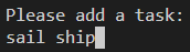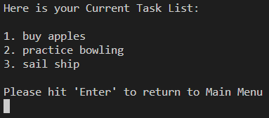 CSharp_Task_Manager A simple C# console Task Manager app Main Menu Enter a Task List Tasks Remove a Task Task is Removed Mark a Task Complete Task is Marked Complete