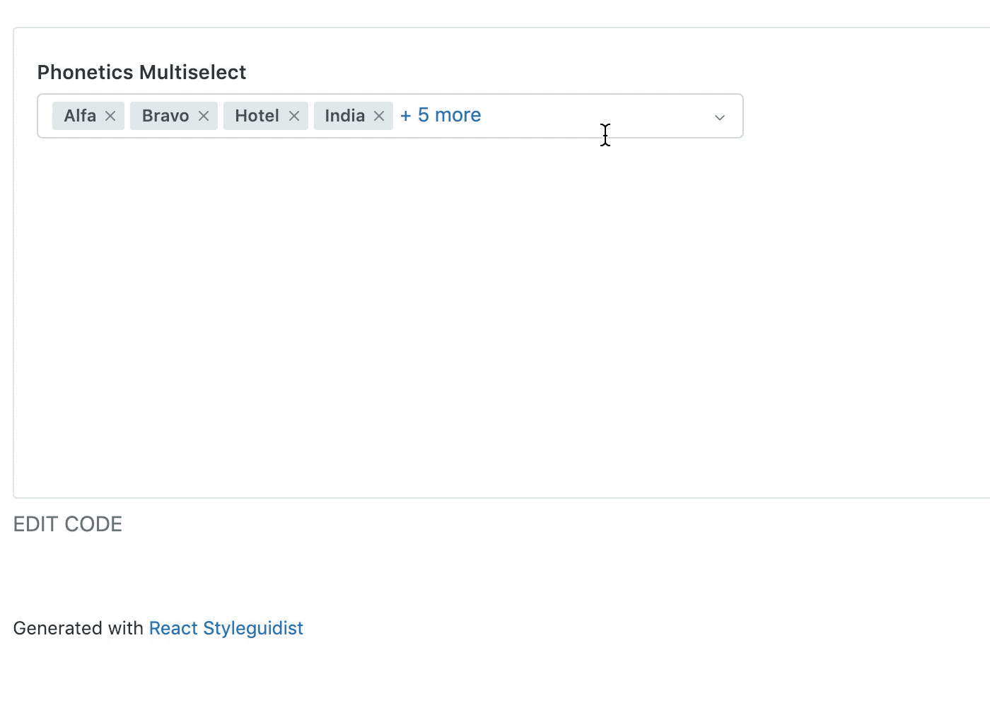 This is coming together nicely, @Austin94! Along with Allison's "delete" comment, can you add an example for what it feels like to have a MultiSelect that can add values dynamically? I.e. if I type foo (followed by comma/enter), then that is converted to a tag and added to the list.