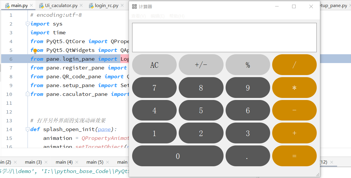功能: 代码实现的效果为登录注册界面,登录成功还有计算器界面。可以当成pyqt5的一个小项目。