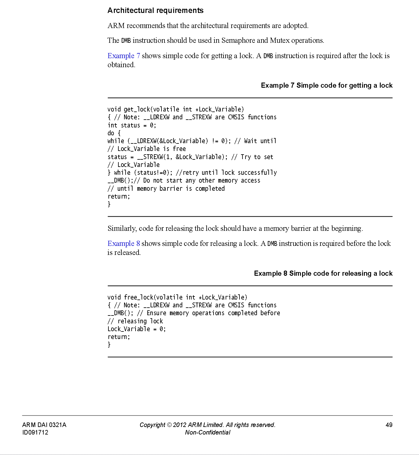 ARM recommends that the DMB instruction should be used in semaphores and Mutex operations in OS designs.