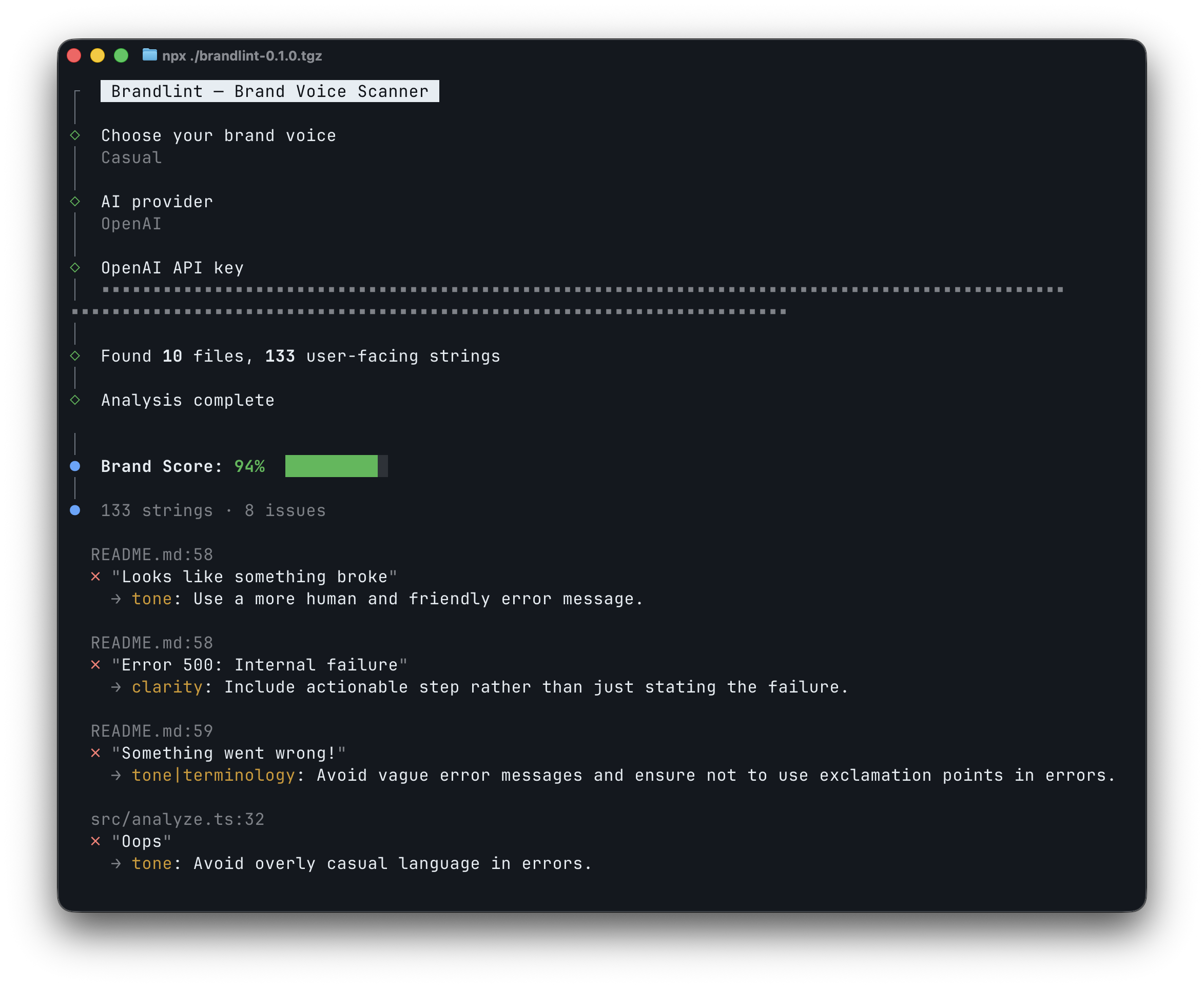Like ESLint, but for your product voice. Brandlint scans your codebase for off-brand copy — inconsistent tone, vague messages, wrong casing — and tells you exactly where to fix it, with file and line number.