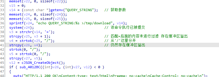 You can see that the V14 register gets the parameters. Then go through (v3 = STRCHR (V14, '='); After processing, it is copied directly into V25, causing a buffer overflow
