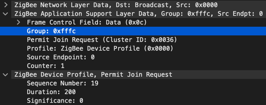 NWKaddressing when sending broadcasts, notGROUP.The oldest Conbee II firmware I can find is 0x26420700 from March 2019 and it exhibits the same behavior. This patch fixes broadcasts on both the current stable (0x26720700 from August 2021) and the old version.