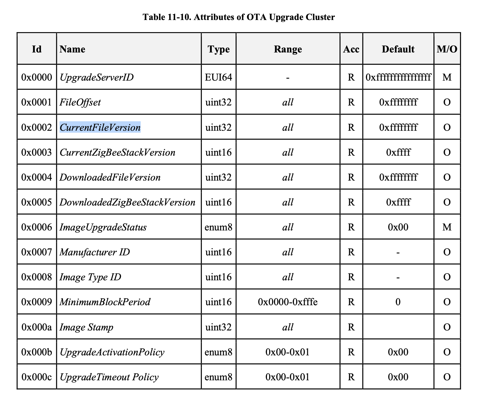 This is what the device is sending when it begins an OTA upgrade. You send it an OTA "image notify" command, it sends back a "query next image" command, which contains this version number. Your devices do not support reading this attribute, the only way it can be queried is when the device itself sends it during an OTA transaction: |