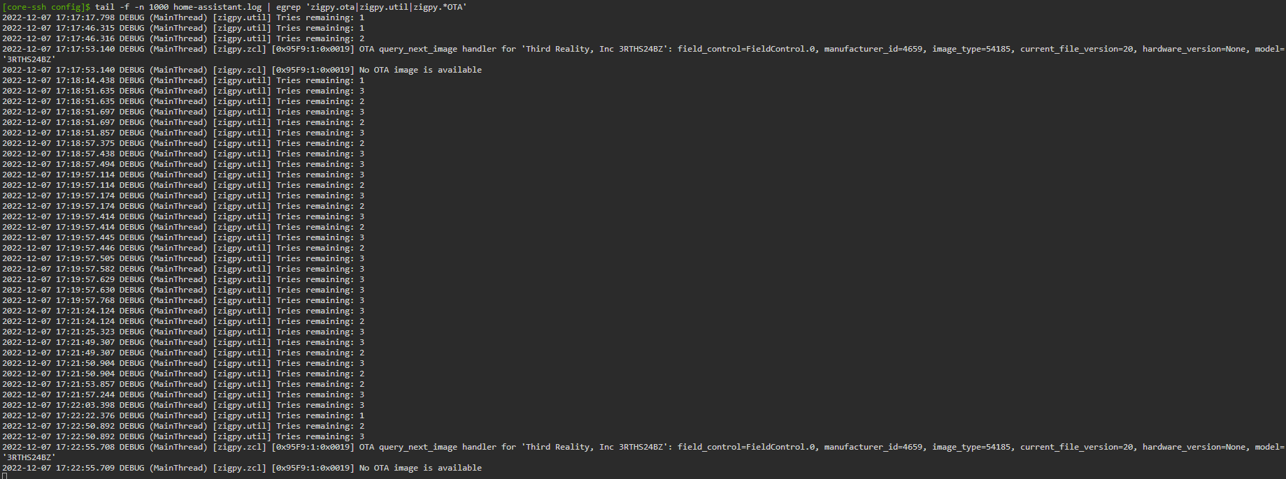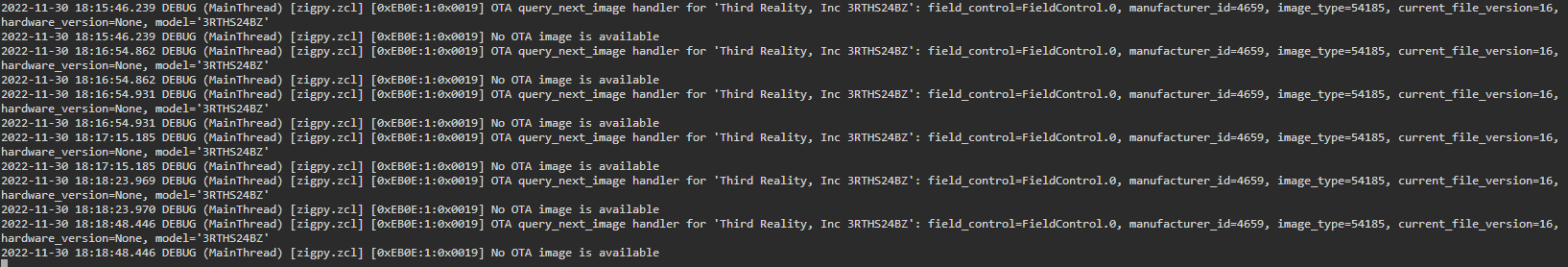 thirdreality_provider: true Here is a log of the temperature sensor updating: 2022-12-07 21:42:52.736 DEBUG (MainThread) [zigpy.zcl] [0x9253:1:0x0019] OTA query_next_image handler for 'Third Reality, Inc 3RTHS24BZ': field_control=FieldControl.0, manufacturer_id=4659, image_type=54185, current_file_version=21, hardware_version=None, model='3RTHS24BZ'