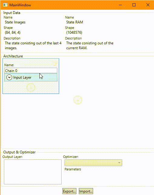 This WPF application, written in C#, offers a easy to understand user interface allowing (unexperienced) users to create network architectures easily. Nevertheless, there are almost no restrictions regarding the network architecture, so that is just as well possible to generate more complex models with NNGui. After the network architecture has been defined in NNGui one can export it as an human-readable .xml file. This .xml file can then later on be parsed by the NNCreator to create a real network model.
