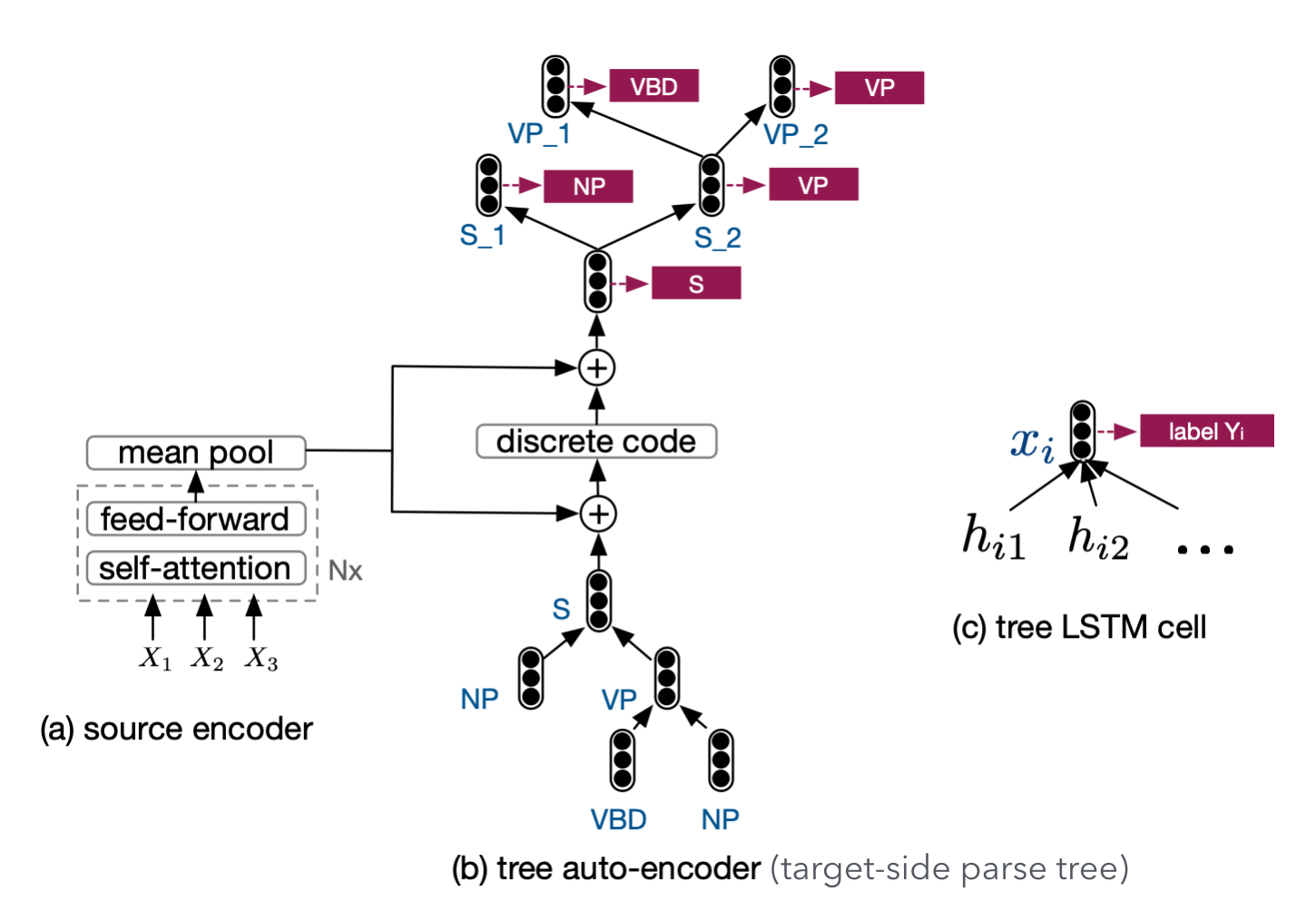 Now, this is the model, it has a pretty clear architecture of TreeLSTM-based autoencoder. The only thing you may be surprised is that we also feed the context of the source sequence into the autoencoder. Why we do this? The reason is simple. Without the source context, you are literally trying to encode almost infinite variations of parse trees into say only 32 codes, which is an impossible task even for Captain America. With the source information, you are just encoding the choice of syntactic structures.