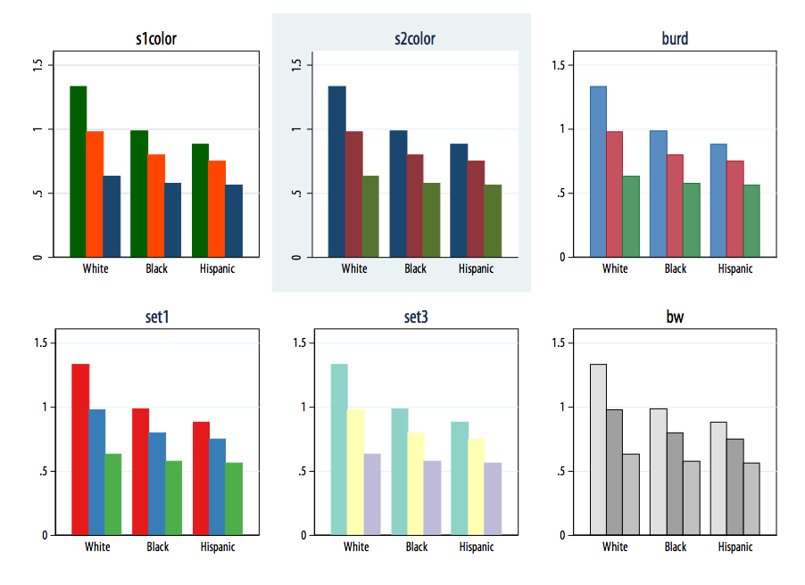 s2colorwith those from the 7-class diverging schemes from ColorBrewer, and the scheme falls back ons2colorafter the ninth data class. Bar colors are shown at 50% intensity. These settings have not been tested for color blindness. - The